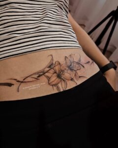 تتو بال های ققنوس و گل روی بخیه شکم